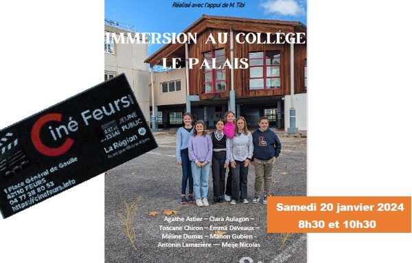 Les élèves de CM2 et leurs parents sont attendus au Ciné-Feurs le samedi 20 janvier 2023 ( selon les modalités d'inscription données dans les écoles ) afin d'assister à la projection du film : "Immersion au collège Le Palais" réalisé par des élèves du collège avec le soutien de M Tibi, professeur d'Espagnol. Cette projection s'inscrit dans le cadre d'un partenariat avec le Ciné-Feurs. Cet évènement marquera la première action du parcours de liaison école collège qui permet aux élèves de CM2, futurs collégiens de se familiariser progressivement avec leur futur établissement et les attendus de la classe de 6ème.